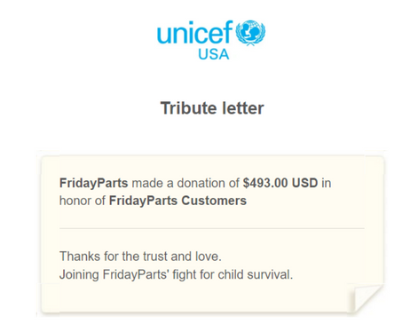 Donations of USD$493 in August, 2022 | FridayParts Global Care Program