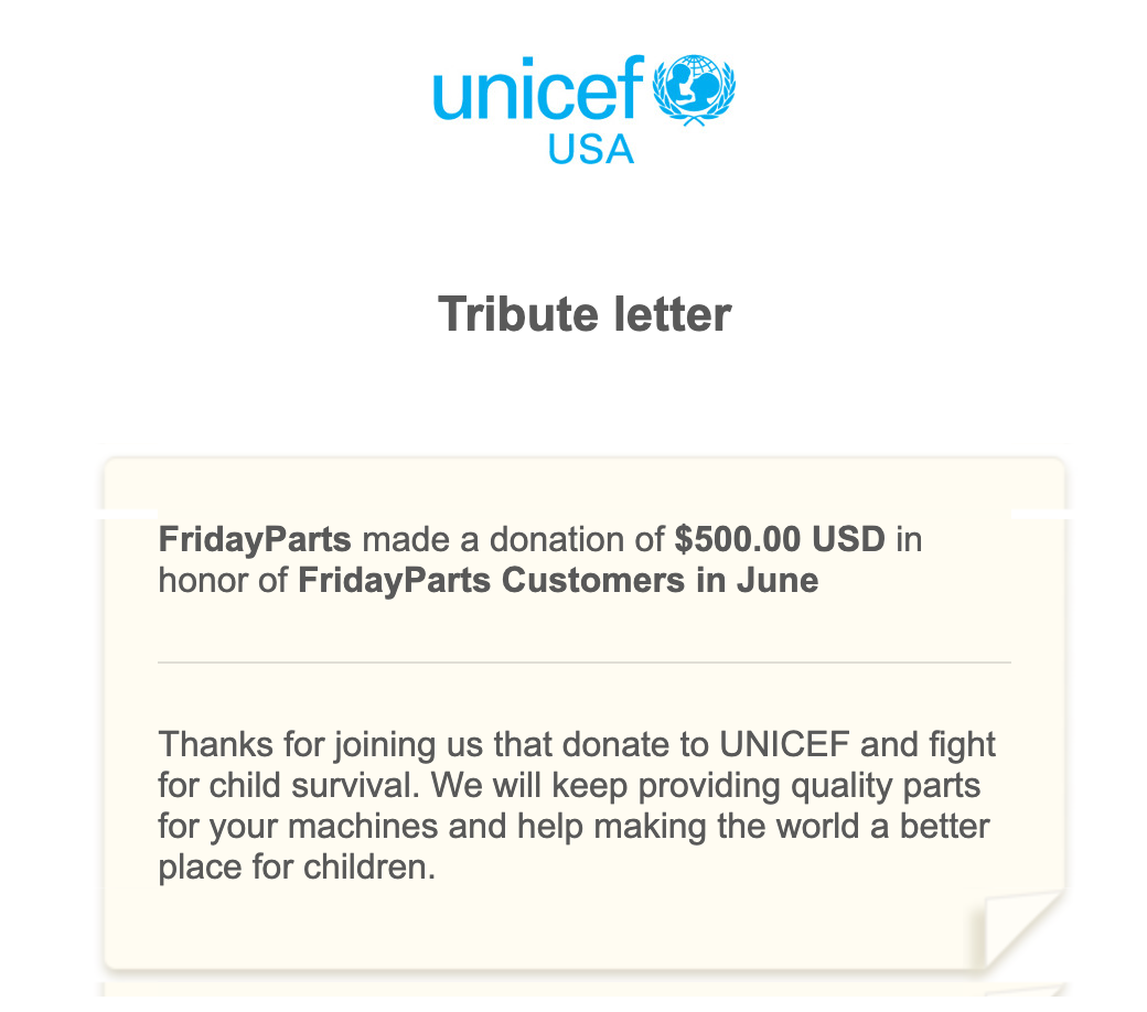 Donations of USD$500 in July, 2023 | FridayParts Global Care Program