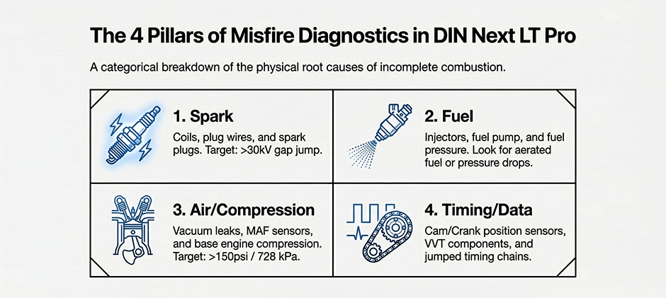 Misfires in heavy equipment generally originate from ignition failure, fuel delivery issues, or mechanical timing discrepancies.